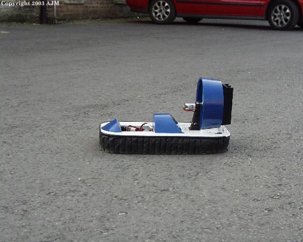 Since these photographs were taken I have produced a C type skirt. This has been interesting in that at first the model would not lift as the top part of the skirt collapsed when full lift was applied. After moving the mounting points of the fingures under the model a further 20mm in towards the centre of the machine the model would lift 6.5 lbs (3kg)dead weight and still have an air gap. However the thrust line had a terrible effect on water as the model tried to become a sub even faster than on the first trials with the old skirt. Experiments continue.